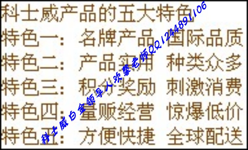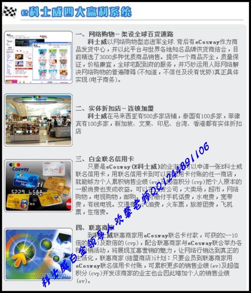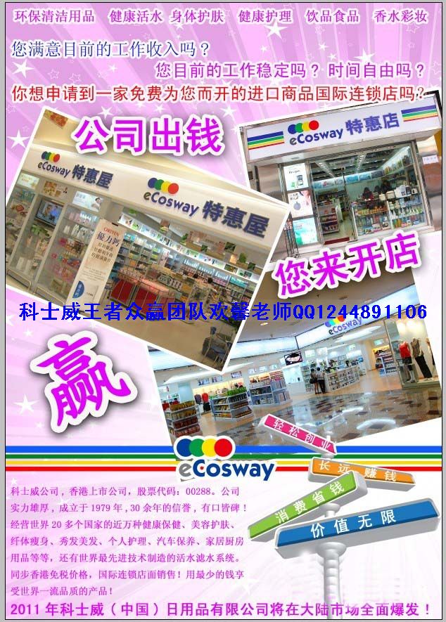 科士威产品以质、值,量化感动你科士威公司成立于1979年,是马来西亚唯二的上市直销公司之一(另一家是安利),在马来西亚发展60多万业主,600多万购物会员,也就是说,在马来西亚每50个人中有一个是做科士威的,10个人是科士威的购物会员。基于这种情况,科士威为了开拓全球市场,2001年,科士威加上了网络,整合了旗下的连锁折扣店铺,信用卡,ecosopp.com电子商务,成立了E科士威!E科士威是电子