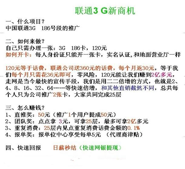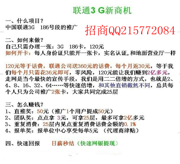 中国联通3G网上营业厅一个伟大的平民创业平台诞生了!!做会员只要120元,公司送你3倍话费!!做会员就等于你在网上开了一家中国联通网上营业厅赚钱,你创业,联通公司买单,让你无需豪华的店铺、高昂的租金就可以拥有一个属于自己的联通网上营业厅。你可以在全国范围内开拓市场,你只要联系客户.其他的一切手续公司全部给你搞定120元注册成为永久会员,送一张全球通卡,送你360元话费直推一张套餐卡,奖励50元,团