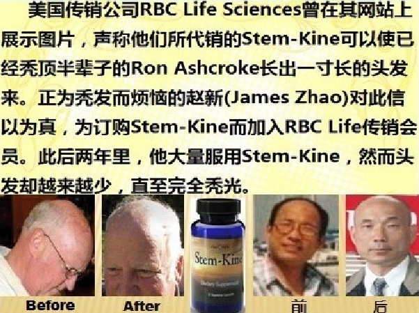 Stem-Kine引起脱发RBC会员有苦难言美国传销公司RBCLifeSciences曾在其网站上展示图片,声称他们所代销的Stem-Kine可以使已经秃顶半辈子的RonAshcroke长出一寸长的头发来。正为秃发而烦恼的赵鑫(JamesZhao)对此信以为真,为订购Stem-Kine而加入RBCLife传销会员。此后一年里,他大量服用Stem-Kine,然而头发却越来越少,直至完全秃光。长期吃“