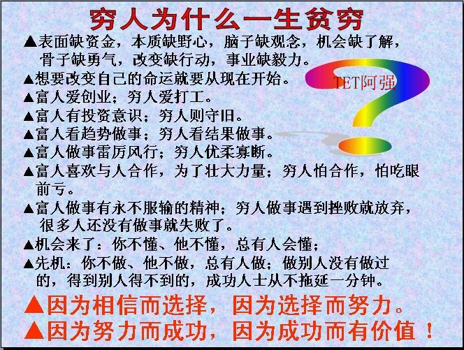一个孩子问一个亿万富翁:“你是怎样成为亿万富翁的?”G“一元钱一元钱地挣呗,当你重复一亿次时,就自然而然地成为亿万富翁了。”富翁回答道。T%T8{“S “挣一元钱并不难,可是怎样坚持一亿次的重复呢?”小孩接着问道。,XY-^5d#A“Z3~“D7e;o:Q:\\)}8^8N%U “你可以不去想一亿次,想得太多反而会增加你的心理压力,让你觉得挣一元钱也是那样遥不可及。你挣钱的时候只想着这是唯一的