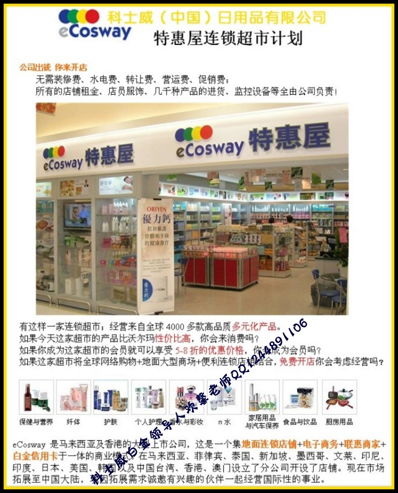 !科士威公司正式在中国内地开业以后,将会以免费店铺的形式,为业主提供更大的支持,您只要成为科士威的业主,就可以申请公司的免费店铺。公司出钱,你来开店,条件如下(可供考参):一、人的条件1.非常认同eCosway的理念;2.必须具有业主身份,能全职投入经营商店;3.有经营管理商店的兴趣及能力;4.有服务其它业主的热忱(该业主不一定是您的下线或上线)。二、财力条件1.不必缴交任何加盟金或类似费用;2.
