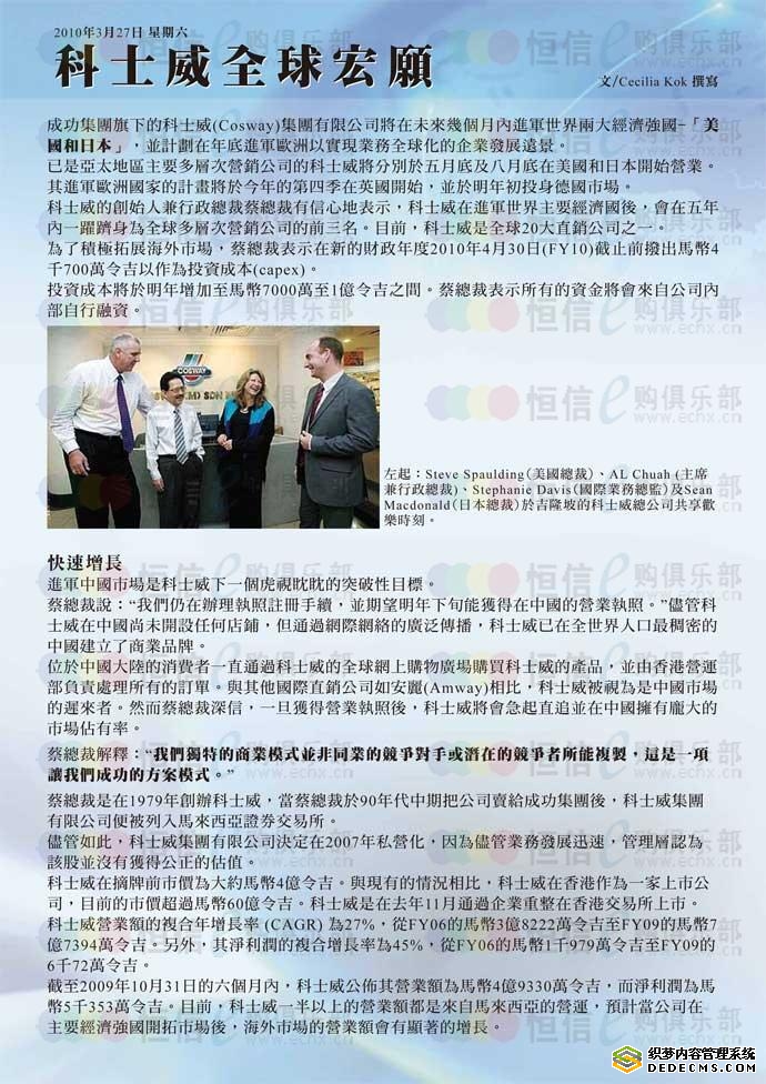 2010年7月刊有国内两家权威《当代直销》和《新华商》杂志社,都刊登了科士威公司的权威报道,对科士威公司的前景以及未来都做了详细的报道。《新华商》杂志7月刊,主要报道“科士威凭什么颠覆传统直销”;《当代直销》杂志7月刊以专刊的形式报道了电子商务以及网购在中国未来的发展趋势,其中重点报道了科士威公司,内容达15-20页以上,篇幅很大,封底封面都是科士威的广告,内容客观真实。北京《当代直销》杂志隶属于
